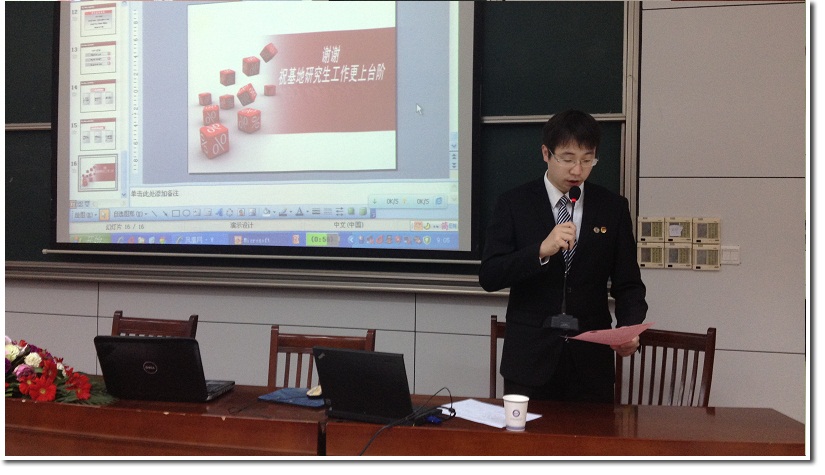 培养基地第一届研究生会主席吴毅华代表培养基地研究生会主席团发言,争取为培养基地研究生提供开阔的科研交流平台,创造活跃的气氛。