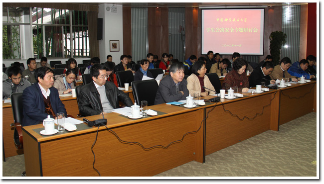 11月9日上午,学校在东区师生活动中心五楼会议室召开学生公寓安全专题研讨会。校党委副书记鹿明、副校长周先意到会并讲话,各学院、有关直属单位学生工作负责人,辅导员、班主任代表,学生代表,学生社区全体楼管员等共近100人参加了研讨会。研讨会由学生工作部(处)、研究生院、资产与后勤管理部、保卫处联合举办,校学生工作指导委员会办公室主任、学生工作部(处)长董雨主持。