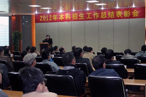 会上,招生就业处处长傅尧作了2012年本科招生工作总结报告,介绍了2012年本科招生工作的基本情况以及所采取的一些新举措,包括本科招生的生源组成、招生队伍建设和招生宣传工作,并分析了近几年的招生形势,并提出了改进后续招生工作的一些思路。