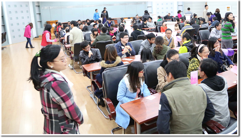 二楼报告厅是“一见倾心”八分钟交友活动区,即使是1分钟的交谈,现场的氛围也十分融洽,大家有序地参与,充分地把握8个1分钟的交谈时间了解对方的信息。