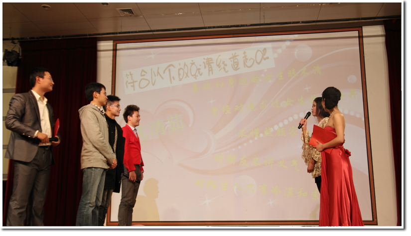 西区学生活动中心广场上还开通了微博上墙,同学们以微博互动的方式表达了自己对爱情的渴望,对邂逅美丽的期盼,现场气氛十分火爆。整场活动持续了近四个小时,节目精彩纷呈,高潮迭起,有人收获爱情,有人收获友情,有人收获欢乐,在这个微寒的季节,送给同学们一段温暖而又热情的记忆。